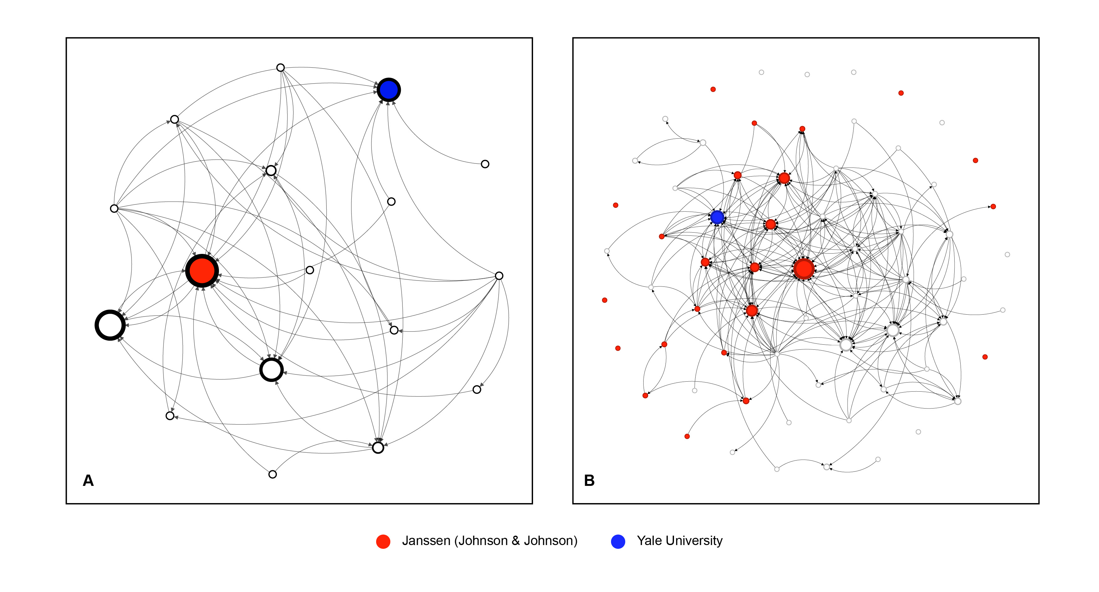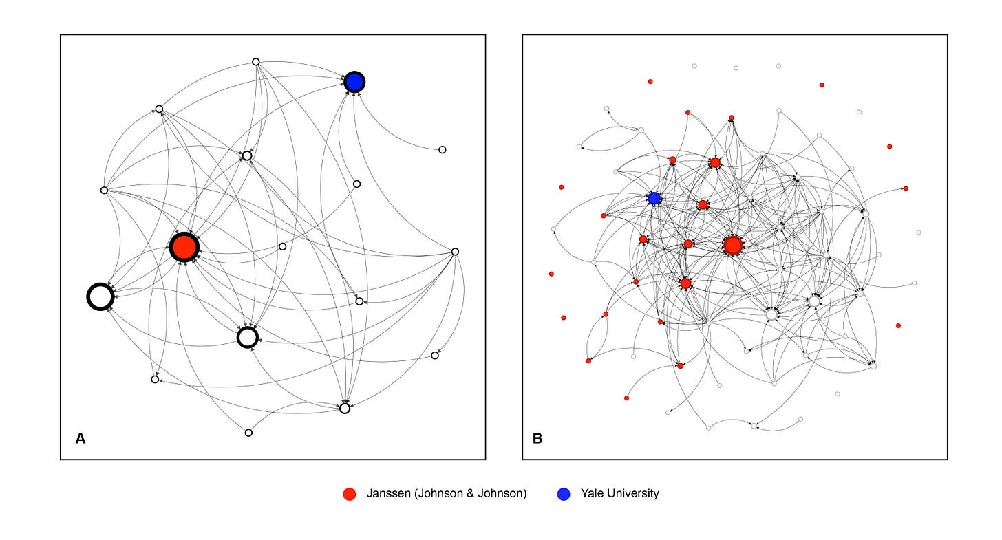 In panel A, Janssen stands out as the dominant hub, with citations flowing in from across the network. Most other firms appear as smaller, more weakly connected nodes arranged around this centre, forming a clear periphery. Yale also appears as a large and well-connected node, closely linked to the central cluster around Janssen.